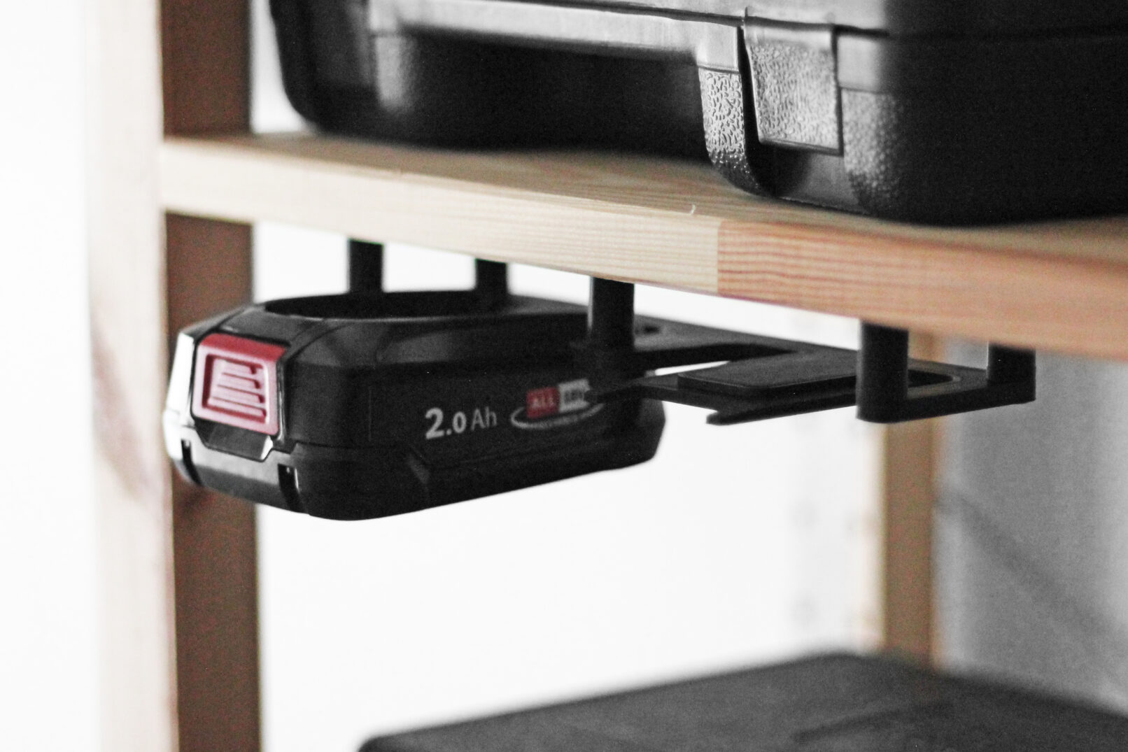 - Schluss mit losen Akkus, die im Regal oder auf der Werkbank rumliegen. Gut organisiert und schnell griffbereit lassen sich die Wandhalterungen einfach montieren - sowohl horizontal als auch vertikal (beispielsweise unter der Werkbank).